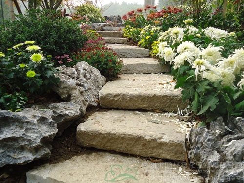 木質(zhì)平臺、石頭、菊花