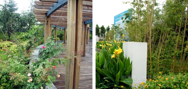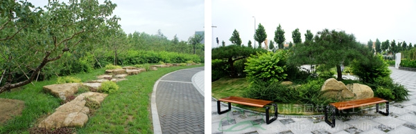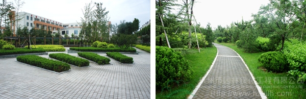 每個景觀節(jié)點(diǎn)上,植物的配置方法都是不一樣的,如在下沉廣場,主要是以小龍柏、金葉女貞等小灌木片植成方形或弧形,間或點(diǎn)綴石楠、梅樹,看起來規(guī)整、簡潔;而在設(shè)計風(fēng)格為江南園林的南廣場上,是將貴重的造型油松單植,通過不同的組合,形成三個風(fēng)格相近的綠島,周邊種植美人蕉、玉簪、竹子,并砌起白墻,上面開圓形拱門或圓窗,散發(fā)出詩意江南的靜謐和婉約氣息?!坝雾降朗秦灤┱麄€景觀的軸線,為了形成曲徑通幽的景觀效果,我們將對植、孤植、叢植都多種方法結(jié)合運(yùn)用,特別是在三叉路口,多種植海棠、櫻花、杏花等,一方面,花開的時候,綠葉間繁花點(diǎn)點(diǎn),會吸引人們不斷向前探尋更多的美景;而花落之后,茂密的枝葉又形成隱隱約約的視覺感受,前方轉(zhuǎn)過彎后風(fēng)景什么樣,又讓人很想去看看?!备呓?jīng)理笑著說。