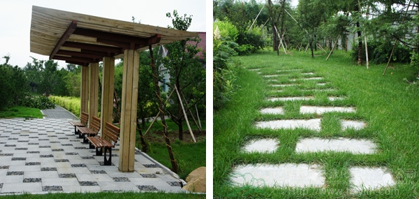 而在道路十字路口的節(jié)點(diǎn)處,則主要是用10cm×10cm的小花崗巖鋪地,鋪出來的路面整潔、平坦,看似簡單,實(shí)則對施工技術(shù)要求相當(dāng)高。草坪中的地面鋪裝,則采用花崗巖汀步,用錯縫鋪裝法,兩塊花崗巖之間用草皮鑲嵌,就像給每塊花崗巖鑲了一道綠邊,與旁邊的草坪和諧地融為一體。貫穿整個工程的游憩步道,全部采用“人字形”的鋪裝方法,中間用透水磚、兩邊以花崗巖鑲邊,透水磚價格不高,用以鑲邊的花崗巖是利用了鋪裝中剩余的邊料,雖然用料簡單,但通過對技術(shù)的嚴(yán)格要求,鋪出的路面卻整潔而不失韻味,是一種實(shí)用、環(huán)保、節(jié)約的做法。
