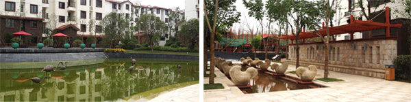 在紫荊東郡小區(qū),水景隨處可見,從主入口兩側近50米的景觀橋水景,到入口正前方一個大型的石雕噴泉,再到小區(qū)里面幾條主干道交匯的十字路口的小型地面噴泉,中心水景上的圓形石雕噴泉,特別是不遠處的動物噴泉雕塑,只只鶴低頭凝思,細長的水流從鼻端的出水口處流出,落入下方的水池里,更是格外引人注目?!斑@些水景小品具有的藝術特性與審美效果,加強了整個景觀環(huán)境的藝術氛圍,成為讓空間環(huán)境生動起來的關鍵因素,在提高小區(qū)藝術品質和景觀形象的同時,更給人們帶來美的享受?!睏罱?jīng)理如是說。