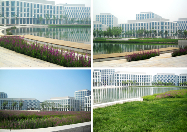 本工程是大型商務園配套景觀綠化工程,整個項目以人工湖為中心將建筑呈環(huán)形布置,分為內(nèi)環(huán)、中環(huán)、外環(huán)。綠化圍繞建筑均勻有層次的分布,環(huán)路兩側(cè)栽植國槐;辦公樓之間則種植日本晚櫻、碧桃、海棠等觀花、觀葉類喬木,以及黃楊、女貞等灌木和綠籬;中心湖區(qū)域兩側(cè)的能源半島和濕地半島上被喜水性植物覆蓋,起到凈化湖水的作用,岸邊種植垂柳,開辟休閑區(qū)域;園路鋪裝材料選用水洗石、花崗巖,石汀、鋪裝與綠地自然銜接;再加上花壇和景觀小品,各種觀賞性植物互相襯托,喬木與灌木合理搭配,使得景觀與建筑、環(huán)境完美結(jié)合。