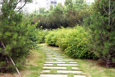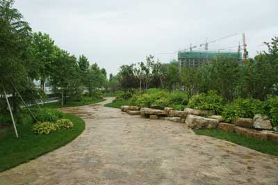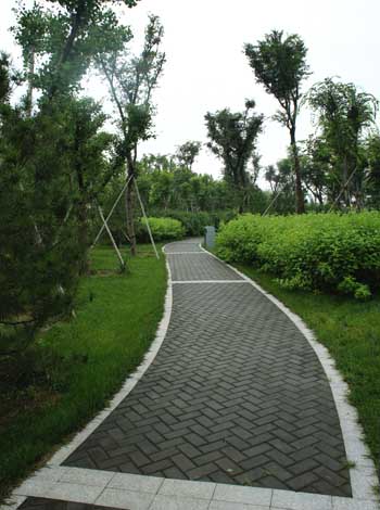 而在道路十字路口的節(jié)點(diǎn)處,則主要是用10cm×10cm的小花崗巖鋪地,鋪出來的路面整潔、平坦,看似簡單,實(shí)則對(duì)施工技術(shù)要求相當(dāng)高。草坪中的地面鋪裝,則采用花崗巖汀步,用錯(cuò)縫鋪裝法,兩塊花崗巖之間用草皮鑲嵌,就像給每塊花崗巖鑲了一道綠邊,與旁邊的草坪和諧地融為一體。貫穿整個(gè)工程的游憩步道,全部采用“人字形”的鋪裝方法,中間用透水磚、兩邊以花崗巖鑲邊,透水磚價(jià)格不高,用以鑲邊的花崗巖是利用了鋪裝中剩余的邊料,雖然用料簡單,但通過對(duì)技術(shù)的嚴(yán)格要求,鋪出的路面卻整潔而不失韻味,是一種實(shí)用、環(huán)保、節(jié)約的做法。