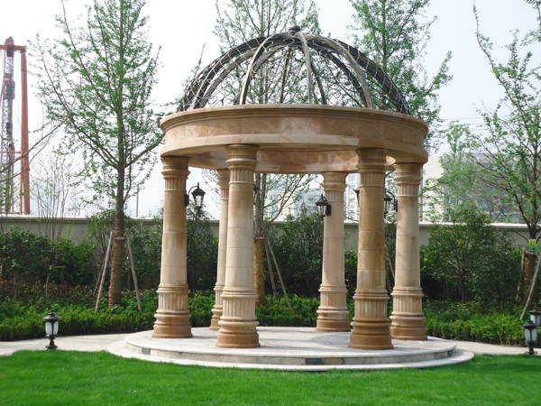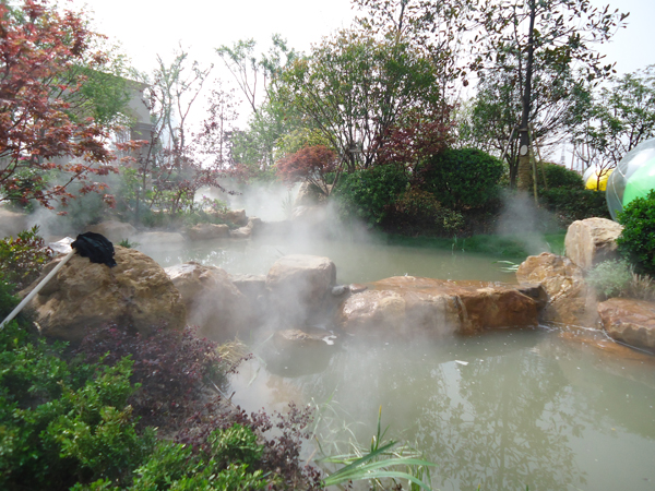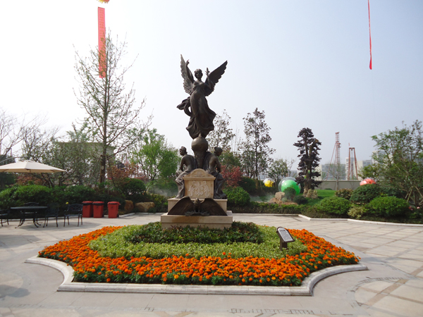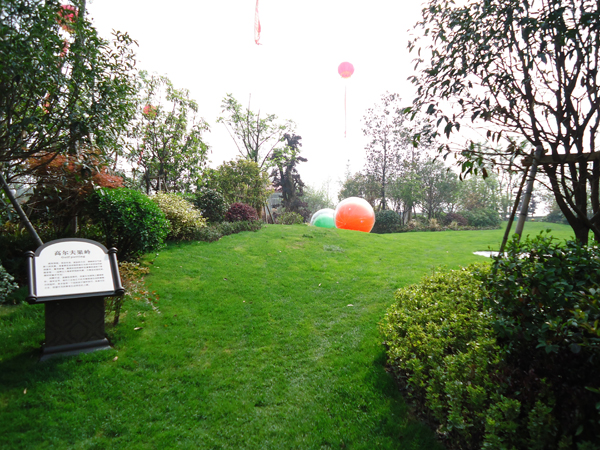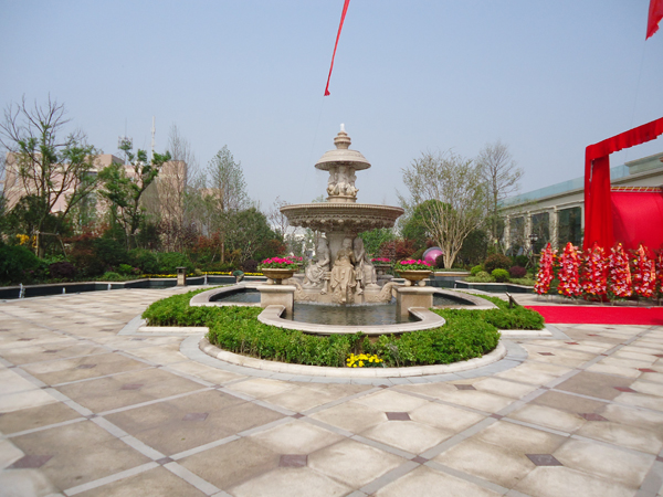 更引人注目的,還有銷售展示中心前面的雕塑噴泉,該噴泉運(yùn)用花崗巖整石雕刻拼接而成,工藝極其復(fù)雜,自上而下不斷灑落的水花,營(yíng)造出一片清涼;無(wú)以復(fù)加的鏤空鐵藝圓頂繁復(fù)花紋和拱門(mén)的石材立面裝飾的皇家景觀亭,精致中透露出大氣;潺潺溪流、霧氣繚繞的人工溪澗,如夢(mèng)似幻;大面積的高爾夫果嶺草坪蜿蜒起伏,華貴雍容……