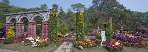 作品最大特色之處在于對(duì)原地形的充分利用及合理改造,依山勢(shì),按水理,精細(xì)打造每一個(gè)駐步休憩之所,搭配這種菊花,或色彩,或形狀,以此營(yíng)設(shè)自然而又不失韻味的菊花景觀(guān)。最后,讓人融入其中,步伐、氣息、身影混雜交錯(cuò),展示出城市生活中人們努力追求或回憶的一種起居文化,亦或是一種清凈、淡雅的“和”文化。