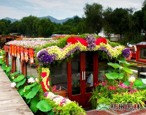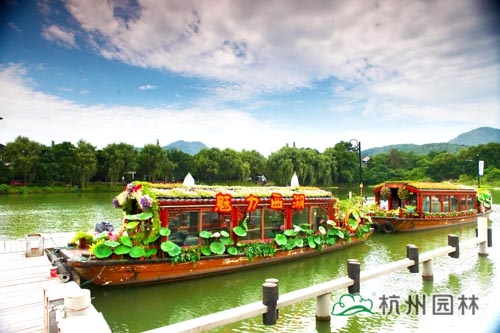 藝術(shù)節(jié)期間,首次在西湖湖面上配置6艘荷花花船,極大地提高了荷花節(jié)的觀賞性和趣味性,成為西湖中一道流動(dòng)的荷花美景。其中,由杭州市園林綠化股份有限公司設(shè)計(jì)制作的“魅力西湖”荷花游船,將插花技藝與園林布景手法有機(jī)結(jié)合,用康乃馨、勿忘我、太陽(yáng)花等與荷花組景,既突顯了“主角”荷花的秀麗、典雅,又使整艘船的色彩明艷豐富,將熱鬧的節(jié)日氛圍巧妙烘托。