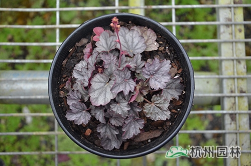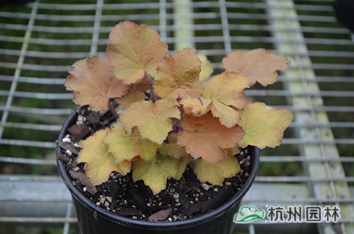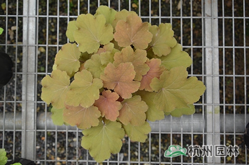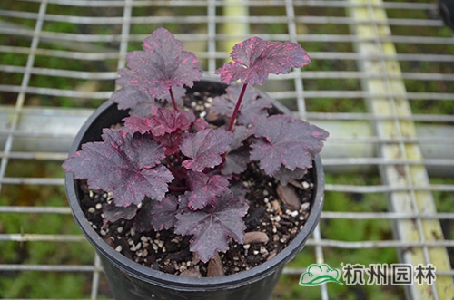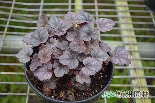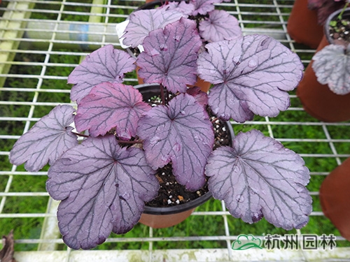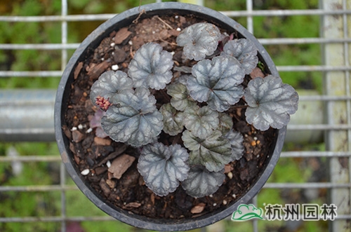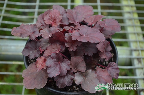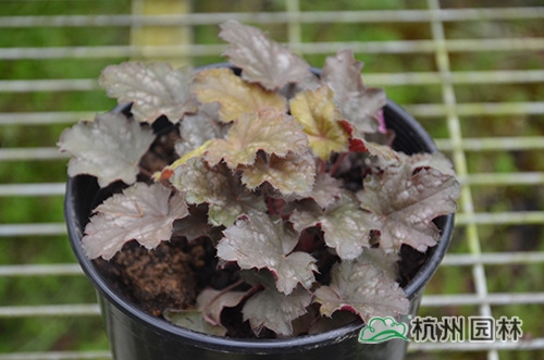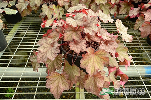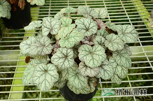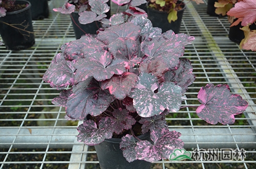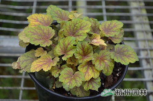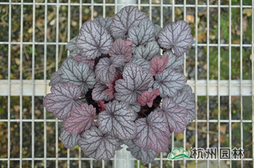 礬根又名小花腎形草,英文名為“Alum root”(因根部不規(guī)則膨脹而來),因此在引入中國的時(shí)候被翻譯成了“礬根”。礬根葉色繁多,且葉色會(huì)隨著季節(jié)、環(huán)境、溫度和光照條件的變化而改變。例如,‘蜜桃黃’在春天的時(shí)候,葉子展現(xiàn)出細(xì)膩的銀色光澤,成熟的葉片顏色會(huì)呈現(xiàn)紫色并略帶玫瑰紅;‘赤砂巖紅’的葉色會(huì)從桃紅色變?yōu)榱零~黃色,再變?yōu)榫G色帶有琥珀色;‘貴族紫’葉子的顏色會(huì)保持穩(wěn)定的紫色,冬天的葉子會(huì)變成銀色。