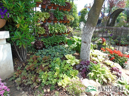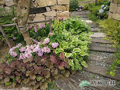 多彩的礬根與玉簪搭配,營造出色彩明快的林下地被景觀