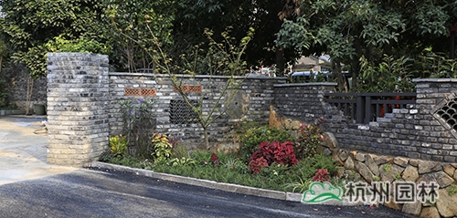 錢三組共有31戶人家,以前,這里家家都是高墻大院,雖然每家的小樓都蓋得很有特色,但卻被高高的院墻擋住了院內(nèi)的風光,而且整體綠化景觀單一,缺乏本土特色和文化氣息。如今,高高的圍墻被拆除,改為以舊青磚為主,搭配鋁合金欄桿,以老石板、舊瓦片、老石磨、老石鼓等作為點綴,懷舊物件與現(xiàn)代元素有機結(jié)合,營造出全新的集古樸與時尚于一體的敞開式景墻。在景墻內(nèi)側(cè)種植桂花、意大利絡石等綠籬,墻外地面種植麥冬等常綠草本植物;在每家庭院入口兩側(cè)和一些節(jié)點處設置小花境,種植各類常綠、色葉、草花等植物,營造出風格多樣的花境景觀,在軟化景墻生硬感的同時,景觀更加豐富多變。