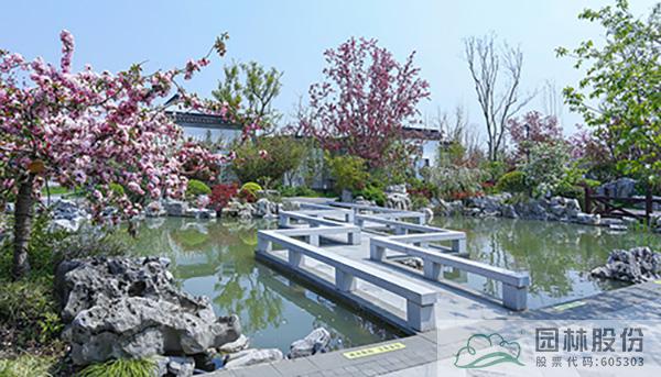 曲折的小橋?qū)@中的水系一分兩半,一邊是平面的水面,一邊是層層跌落的流水,動靜結(jié)合,意蘊(yùn)悠遠(yuǎn),帶給人們更加豐富的景觀體驗(yàn)。而不同的植物配置手法,也讓海棠顯得更加豐姿婥約,優(yōu)美動人。