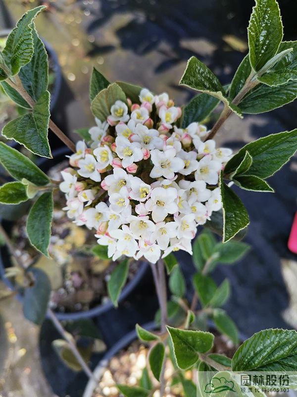 忍冬科莢蒾屬,半常綠或常綠灌木,株高2-3 m,為紅蕾莢蒾和煙管莢蒾的雜交種。葉色深綠,秋季轉(zhuǎn)紅,顏色程度因所處地區(qū)而異。該種繼承了紅蕾莢蒾粉花的優(yōu)良基因,花序未開放時(shí)呈現(xiàn)靚麗的粉色,開放后白色,且具有較濃郁的花香?;◤揭话?.5-10 cm,花期3-4月。植株具有良好的頂端優(yōu)勢,枝條年生長量大,但分枝能力稍弱。幾乎無病蟲害。適應(yīng)性強(qiáng),生長速度快,耐干旱且耐寒,適合自然風(fēng)格的工程應(yīng)用或庭院觀賞。