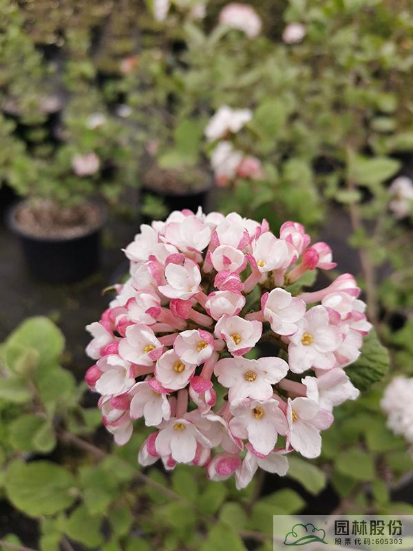 忍冬科莢蒾屬,落葉灌木,株高1.5-2.5 m。被認(rèn)為是典型的芳香樹種,非常受歡迎。原產(chǎn)于韓國,日本對馬島。葉子深綠色,秋天變成酒紅色到柔和的紫色。半球狀聚傘花序,花苞粉紅色到紅色,開放成白色,花徑4.5-8cm,花期3-4月?;ㄏ銤庥?,通常在紅蕾雪球莢蒾之前開花。對土壤要求不高,喜石灰性土壤,全光照和半蔭條件下都能正常生長,適合工程應(yīng)用或庭院觀賞。1902年被引入英國皇家植物園(kew)的邱園。