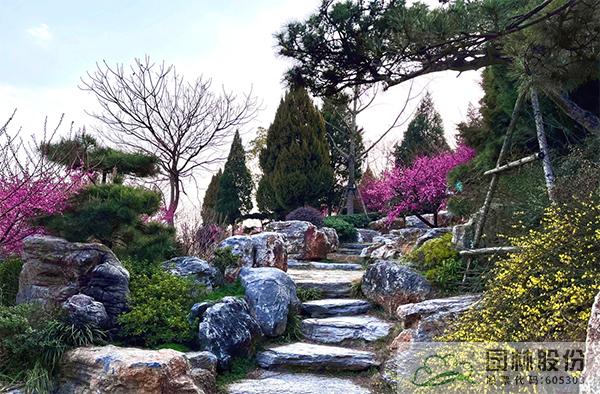 運用山石點綴園林空間,比如:路石、駁岸、擋土墻、石磯、踏步、護坡、花壇,既造景又具實用功能;石材的機理及質感在環(huán)境中可起到點晴作用,使園林空間層次感及深度得以加強。
