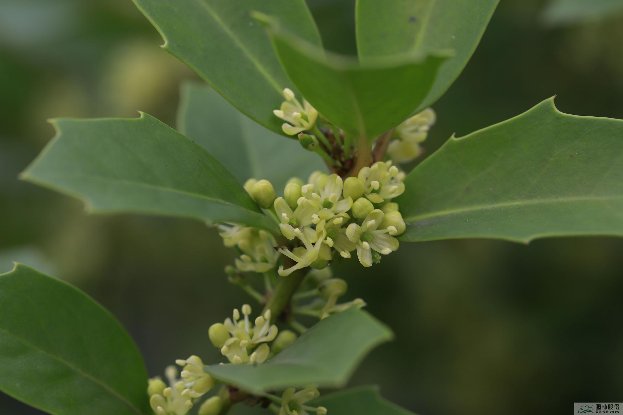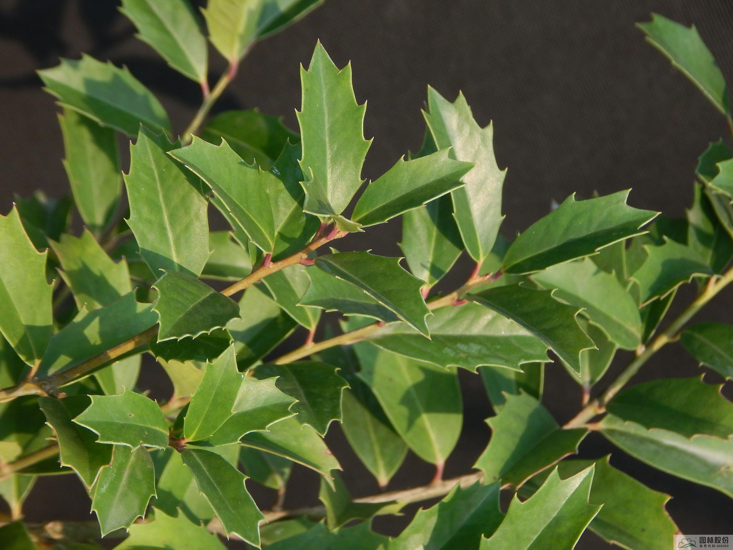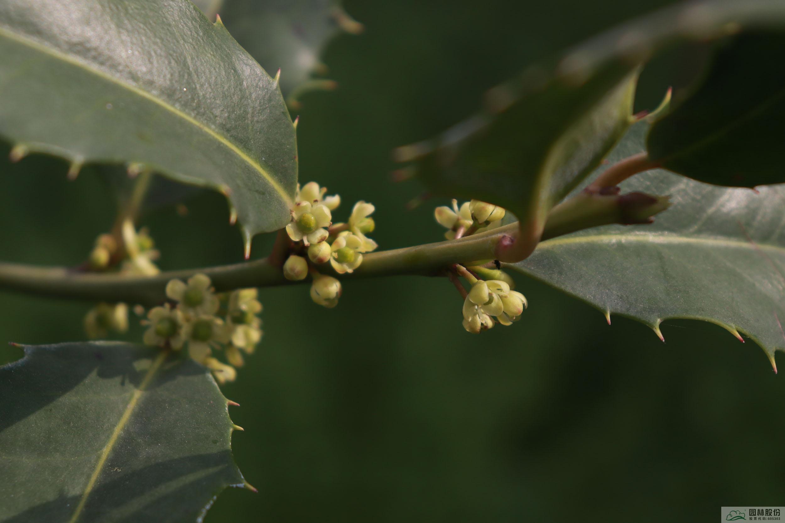 本品種為無刺枸骨Ilex cornuta ‘Fortunei’與全緣冬青Ilex integra種間雜交選育獲得。常綠喬木,雄株,植株圓錐狀。葉片厚革質,四角狀或不規(guī)則,先端漸尖,具一枚刺齒,葉柄紫紅色。雄花黃綠色,花期為4月中上旬。
